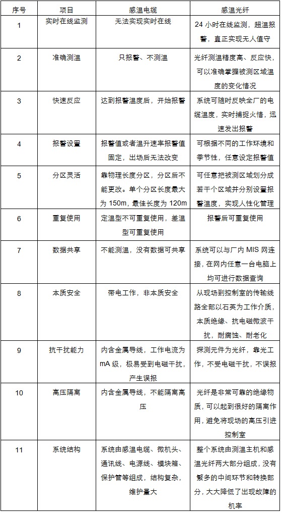 表1:感溫電纜與感溫光纖的性能對(duì)比
