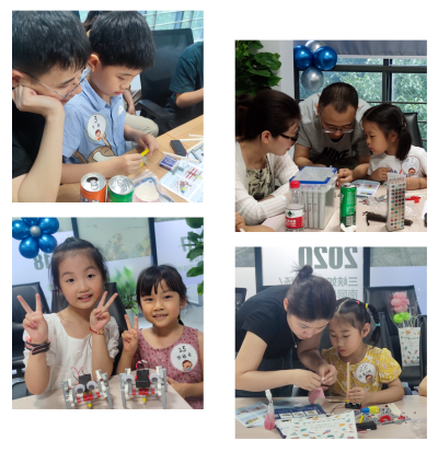 家長陪同小朋友一同完成六足機器人以及小臺燈的組裝,