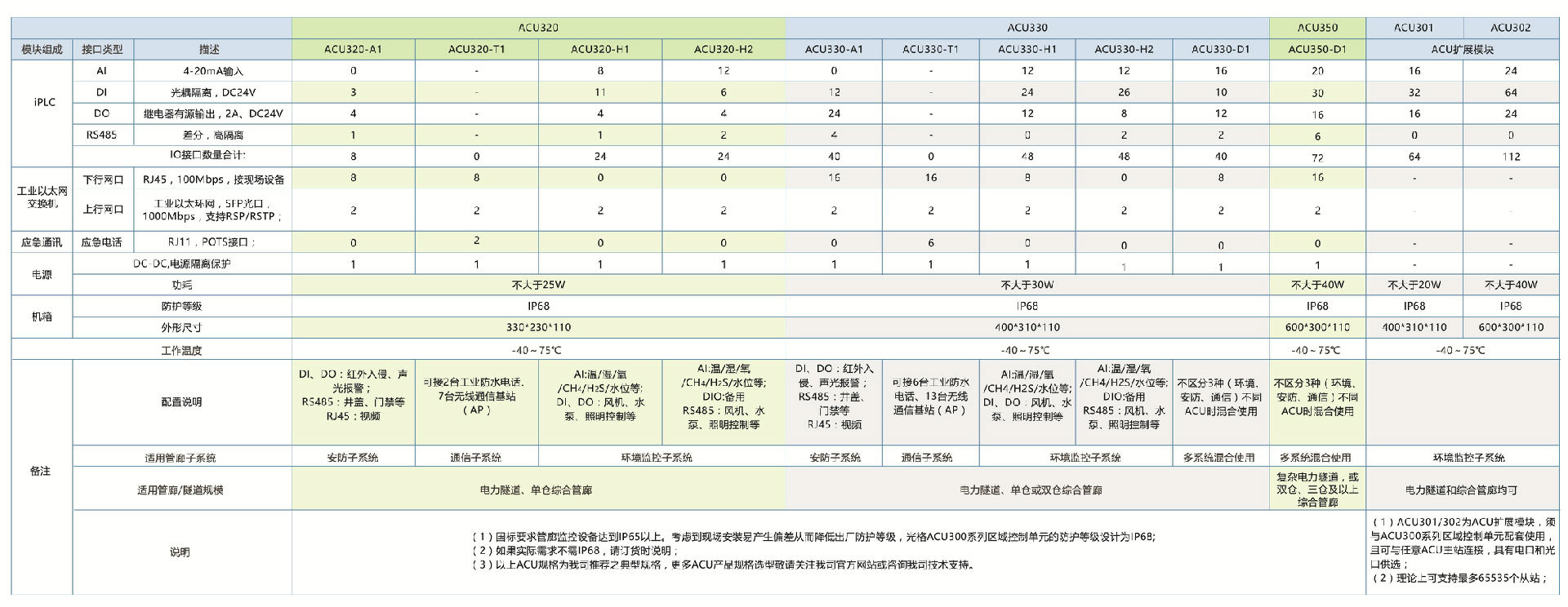 ACU300提供豐富的典型預配置,充分滿足單倉至五倉管廊/隧道的需求。