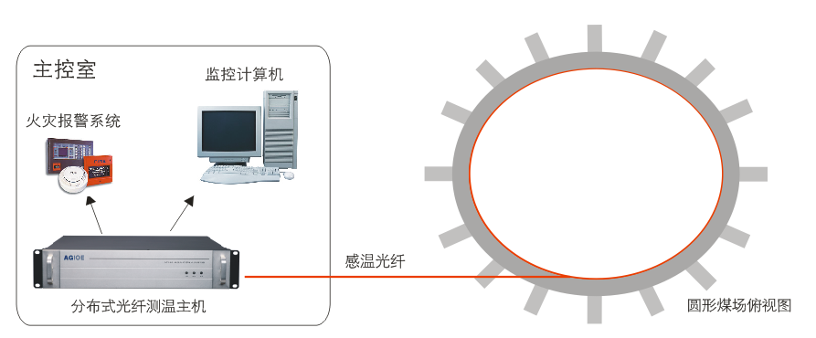 光格自主研發、生產的分布式光纖感溫火災探測系統由分布式光纖測溫主機、感溫光纖、監控計算機、監控管理軟件、與消防系統聯動的設備等組成,實時監測圓形煤場四周側壁的溫度與火災情況,發現自燃隱患即時聯動火災報警設備,及時消除險情。光纖測溫技術本征安全,測溫靈敏度高,不僅可以測量煤場溫度情況,還可對溫度異常位置進行準確定位,方便工作人員快速排除隱患。