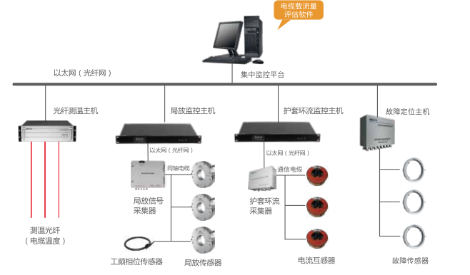 電纜本體狀態監測系統主要包含電纜溫度監測及載流量評估系統、局部放電監測系統、護套環流監測系統和故障定位系統。采用電纜本體在線監測手段,實時監控電纜運行溫度及接地環流數據、局部放電信號和電纜故障行波信號。通過多種監測數據診斷電纜運行狀態,對異常情況進行及時預警,保障電纜運行安全。當電纜發生跳閘故障時,可提供故障分區、故障點位置等信息,減少電纜故障運維時間。