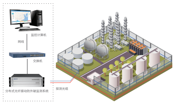 光格廠區(qū)周界安防系統(tǒng)由分布式光纖振動(dòng)防外破系統(tǒng)、探測光纜、上位監(jiān)控主機(jī)和基于GIS的周界安防綜合在線監(jiān)測軟件組成。