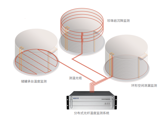 光格LNG儲罐綜合監測系統,由分布式光纖測溫主機及相應的附件組成,包含儲罐承臺溫度監測、儲罐珍珠巖沉降監測和儲罐環形空間泄漏監測。獨創的環形監測系統,當光纜發生單點破壞后,不影響火災探測系統工作性能,大幅度提升系統可靠性。