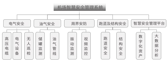 光格機場智慧安全管理系統(tǒng)主要由電氣安全監(jiān)測系統(tǒng)、油氣安全監(jiān)測系統(tǒng)、周界安防系統(tǒng)、跑道及結(jié)構(gòu)安全監(jiān)測系統(tǒng)、智慧安全管理平臺組成。系統(tǒng)基于物聯(lián)網(wǎng)感、傳、知、用技術(shù),實現(xiàn)機場資產(chǎn)的實時安全監(jiān)測,輔助管理者進行科學(xué)決策及運維。